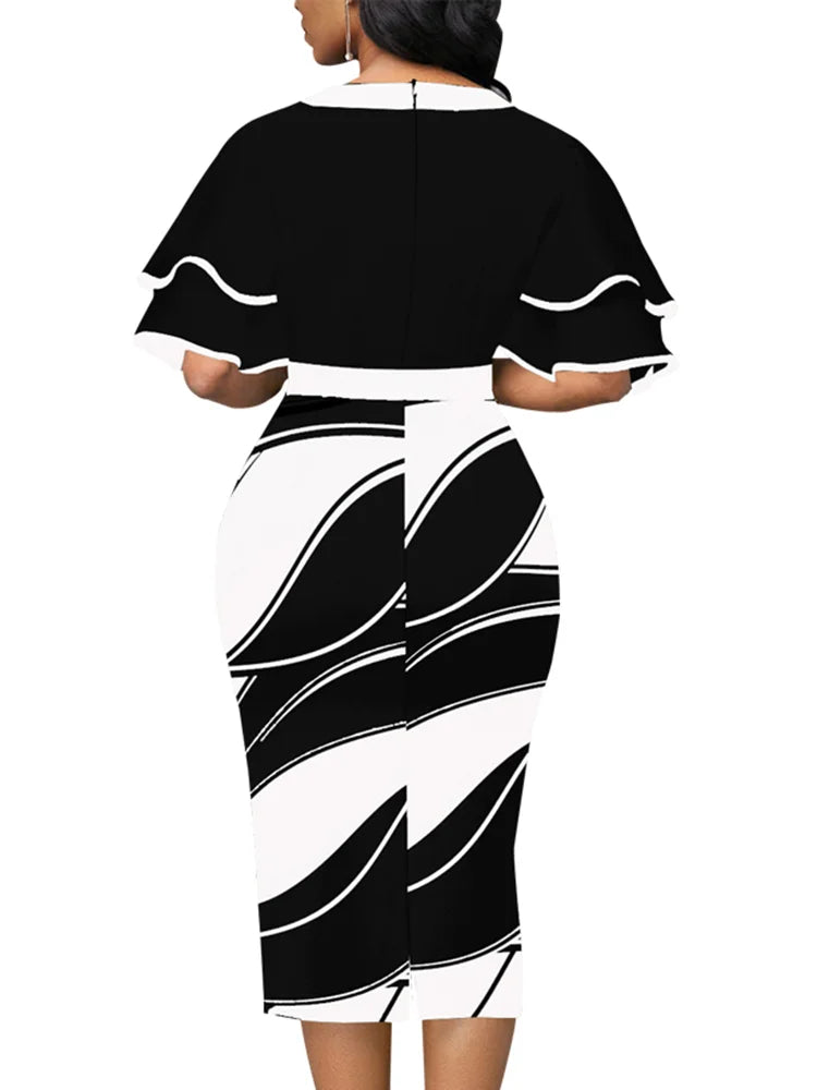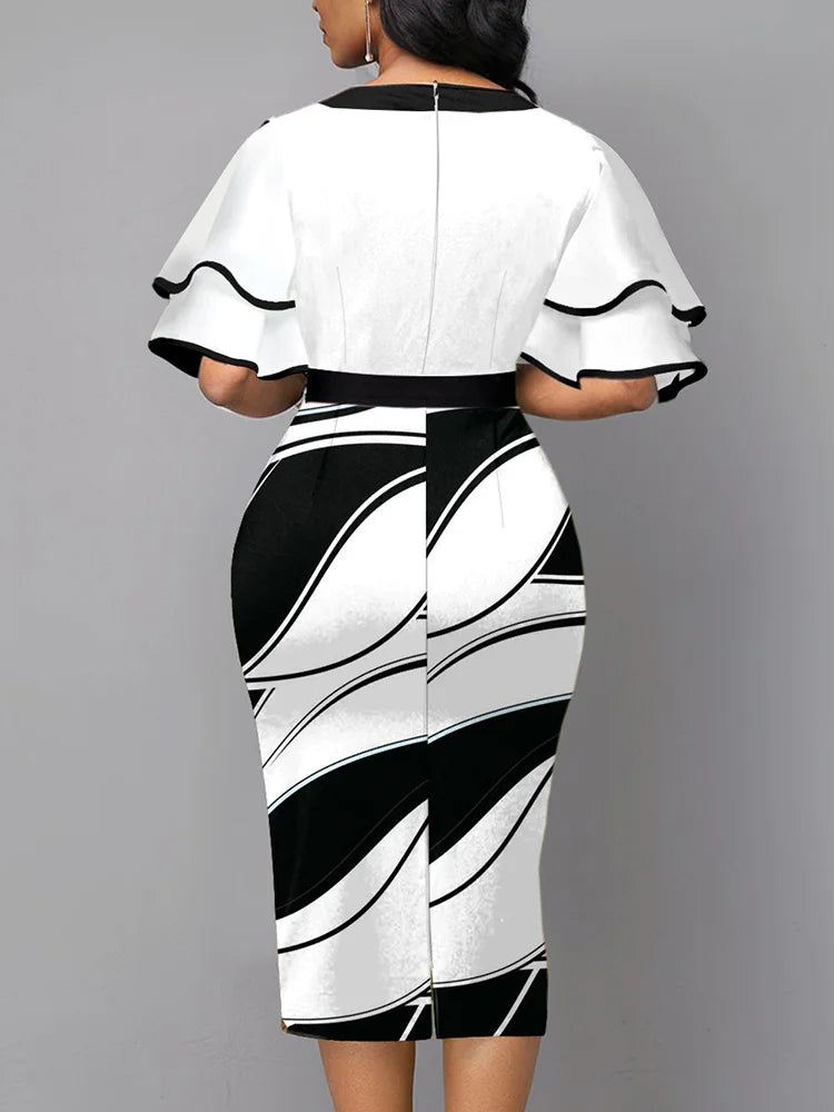 Dresses for Women Floral Bow Decoration and Lotus Leaf Sleeves Work Dress Office Lady Vestidos De Mujer Elegant Midi Robe Female