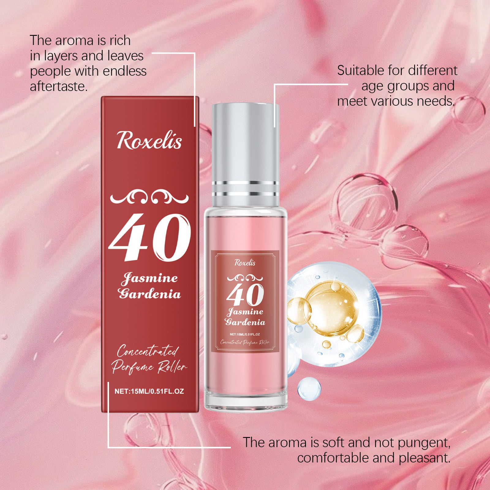 Product information: Net content: 15ML Category: Body Care Kit Product Name: jasmine Gardenia Brazilian charm perfume Key words: Perfume